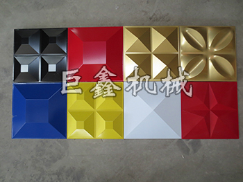 三维扣板设备生产的三维板不仅可以用于店面的门头装饰,也可以用于室内外墙面装饰、吊顶装饰。三维板和我们常见的立体软包材质不同。三维板采用镀锌板为原料,依托原成熟工艺,彩钢三维板相比同类的塑料三维扣板,本产品材质轻盈,质量好,不易掉漆,不易变形, ,,,寿命长。色彩丰富,可灵活组合,花式多样,新颖,安装方便。